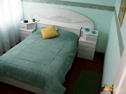 Depending on the apartment, it can be double bed or queen bed. There is also a one bedroom apartment with 3 single beds. Most of the apartments have a sofa bed in the living room.