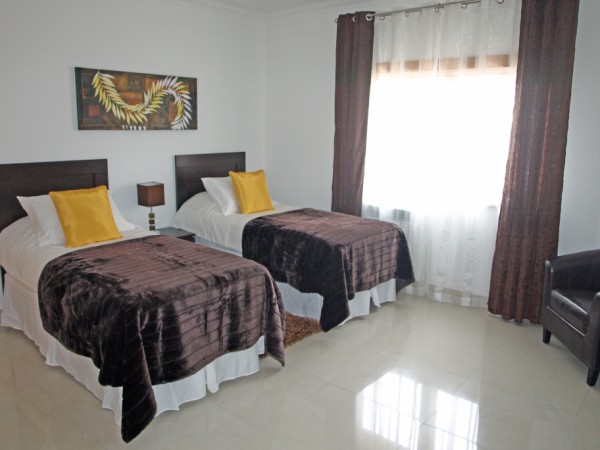 This villa recently constructed situates within the Praia Del Rey Golf & Beach Resort. The villa beautifully furnished, has 4 spacious bedrooms, all with ensuite bathrooms. Two of the bedrooms are on ground floor, one with a double bed and the other with 2 single beds. The master bedroom donwstairs has large doors to access the garden and pool. The other 2 bedrooms on 1st floor, again with one double bed and two singles, access a large terrace with table, chairs and sunloungers, being a perfect for sunbathing, with a very calm view to part of the resort and fields. All 4 bathrooms have a bathtub and shower each. The very modern kichten completely equipped has large doors giving access to dining room and another door to exterior patio with barbeque. The spacious living room with fireplace, Plasma TV with satellite, DVD and 3 very confortable sofas, is very bright with french doors all around overlooking the patio, the garden and the 6mx12m swimming pool (pool heating optional and not included on price). On ground floor patio there are table and chairs for 8 as well as 4 sunloungers. |