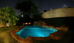 Palm Gardens Guest House is tastefully decorated and beautifully furnished. All 4 rooms have ocean views, air-conditioning, individual DSTV, tea and coffee facilities, fridges, pool & bath towels. Guests have use of the semi enclosed outside lounge and BBQ facilities, as well as a beautifully landscaped garden and rock pool, for children there is a jungle gym with a slide, sand pit and climbing wall around the pool area. There is secure parking inside the property. A Full English breakfast is served every morning, and dinner and/or lunch can be arranged upon request. Palm Gardens Guest House is centrally located and close to all amenities. Laundry can be done at an additional cost upon request. Rooms are serviced daily. Please feel free to contact us should you have any queries. We look forward to hosting you soon. |